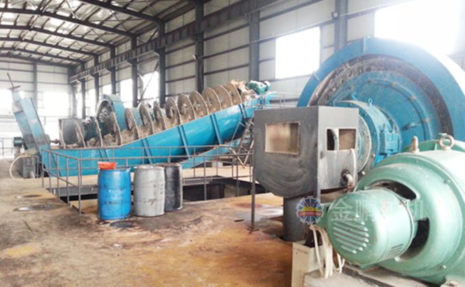 本工藝采用兩段一閉路破碎流程,合格產(chǎn)品進(jìn)入粉礦倉(cāng)緩存,礦石由擺式給礦機(jī)均勻的給到直筒節(jié)能格子型球磨機(jī)進(jìn)行磨礦,格子球磨機(jī)和高堰式單螺旋分級(jí)組成一段閉路磨礦分級(jí)流程。球磨機(jī)的排礦先經(jīng)過(guò)跳汰機(jī)富集大顆粒金,跳汰機(jī)底流通過(guò)兩段搖床選出30%品位的顆粒金,跳汰機(jī)的溢流進(jìn)入分級(jí)機(jī)。分級(jí)溢流經(jīng)過(guò)攪拌槽的調(diào)漿后進(jìn)入浮選系統(tǒng),通過(guò)做礦石的可選性實(shí)驗(yàn)研究我們選擇一粗三精三掃的浮選流程,從而很大程度的回收脈石中的有價(jià)金元素。浮選金精礦通過(guò)濃密機(jī)濃縮由過(guò)濾機(jī)完成脫水作業(yè),浮選尾礦由濃密機(jī)濃縮后進(jìn)入壓濾機(jī)進(jìn)行壓濾成濾餅做到尾礦干排。金礦重浮聯(lián)合流程也是金鵬集團(tuán)用于山東黃金集團(tuán)蓬萊大柳行選廠項(xiàng)目中的成功經(jīng)驗(yàn)。