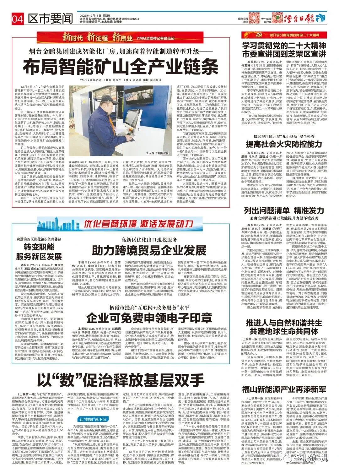 今天(12月16日),《煙臺日報》以《新時代 新征程 新偉業|煙臺金鵬集團布局智能礦山全產業鏈條》為題,大篇幅報道金鵬礦機緊緊抓住“一帶一路”發展機遇,圍繞“大國重器,智造未來”,統籌布局智能裝備制造板塊,實現高質量快速發展。