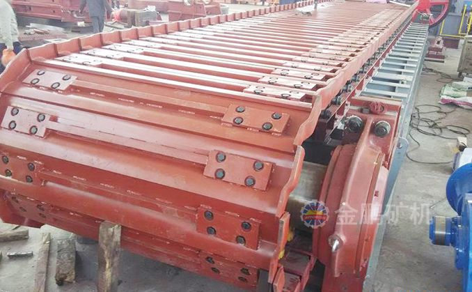 采用節(jié)距為200mm的高強度模鍛鏈條為牽引件,兩根鏈條繞過安裝在機體頭部的一對驅(qū)動鏈輪和機體尾部的一對張緊輪聯(lián)成封閉形回路,在兩排鏈條的每個鏈節(jié)上裝配了相互交迭的、重型結(jié)構(gòu)的輸送槽而成為一個連續(xù)的能夠運載物料的輸送線路。其自重和物料的重量由安裝在機體上的多排支重輪、鏈托輪和滑道梁支承。傳動系統(tǒng)經(jīng)交流變頻調(diào)速電動機聯(lián)接減速機,再由漲套與驅(qū)動裝置直聯(lián)驅(qū)動運載機構(gòu)低速運行。將尾部料倉卸入的物料沿輸送線路運至機體的前方排出,實現(xiàn)向下方的工作機械連續(xù)均勻喂料的目的。