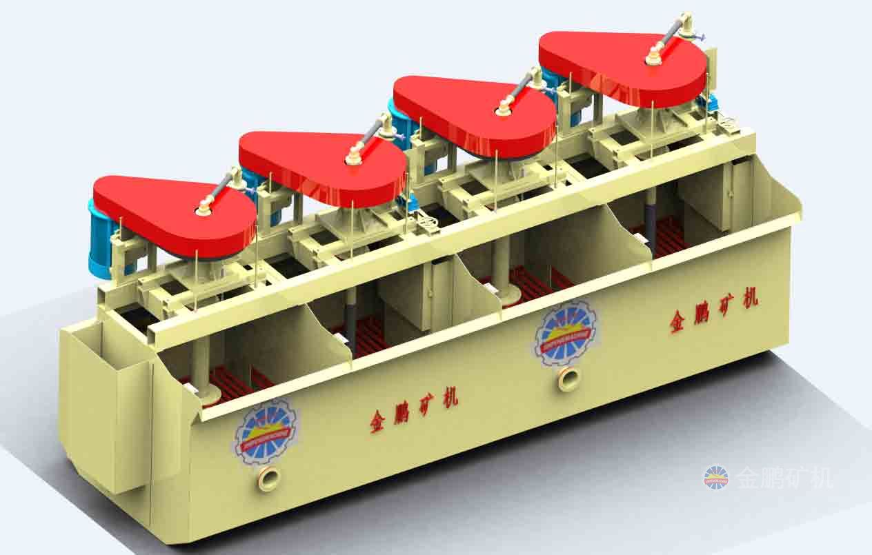 當浮選機葉輪旋轉時,來自鼓風機的低壓空氣通過分配器周邊的孔進入葉輪葉片間,與此同時假底下面礦漿由葉輪下部被吸入到葉輪葉片間,礦漿和空氣在葉輪葉片間充分混合后,從葉輪上半部周邊排出,排出的礦漿空氣混合物由定子穩流后,穿過格子板,進入槽內上部區。此時浮選機內部區礦漿中含有大量氣泡,而外側循環通道內礦漿中不含氣泡(或古有極少量氣泡),于是內外礦漿就形成壓差,在此壓差及葉輪抽吸力作用下,內部區礦漿和氣泡在設定的流速下起上升通過格子板,將粗顆粒礦物帶到格子板上方,形成粗顆粒礦物懸浮層,而礦化氣泡和含有較細礦粒的礦漿則繼 續上升,礦化氣泡升到液面形成泡沫層,含有較細礦粒的礦漿則越過隔板經循環通道,進入葉輪區加入再循環。