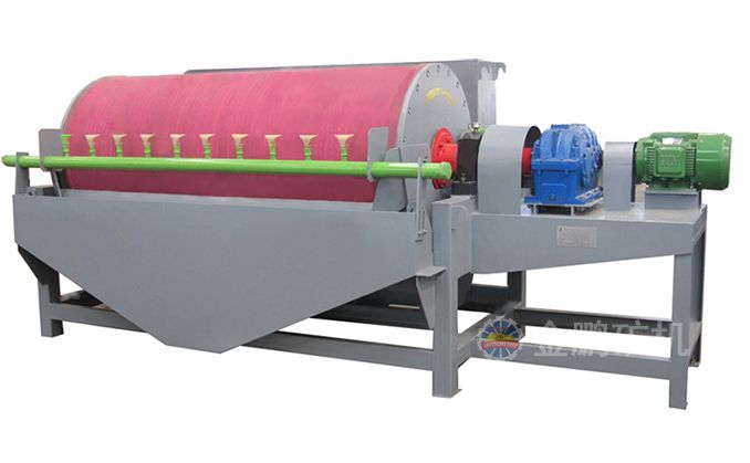 礦漿經給礦箱流入槽體后,在給礦噴水管的水流作用下,礦粒呈松散狀態進入槽體的給礦區。在磁場的作用,磁性礦粒發生磁聚而形成“磁團”或“磁鏈”,“磁團”或“磁鏈”在礦漿中受磁力作用,向磁極運動,而被吸附在圓筒上。由于磁極的極性沿圓筒旋轉方向是交替排列的,并且在工作時固定不動,“磁團”或“磁鏈”在隨圓筒旋轉時,由于磁極交替而產生磁攪拌現象,被夾雜在“磁團”或“磁鏈”中的脈石等非磁性礦物在翻動中脫落下來,最終被吸在圓筒表面的“磁團”或“磁蓮”即是精礦。精礦隨圓筒轉到磁系邊緣磁力最弱處,在卸礦水管噴出的沖洗水流作用下被卸到精礦槽中。非磁性或弱磁性礦物被留在礦漿中隨礦漿排出槽外,即是尾礦。